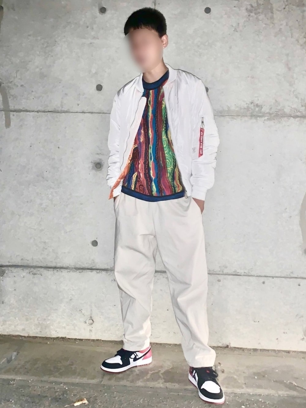 見ていただきありがとうございます😎 白メインにインナーに派手目のCOOGIのニット着ました✌️