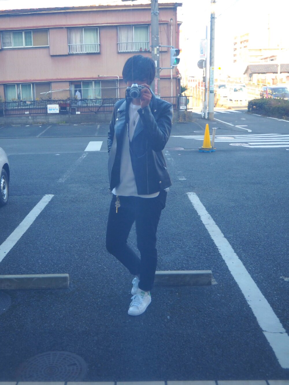 人生初のライダースコーデ! 今日は割と暖かかったので中は軽めにしました。 最近革靴の使用頻度が多かったのでスニーカーも履こうということでスタンスミス履きました!まあ最高ですね😁