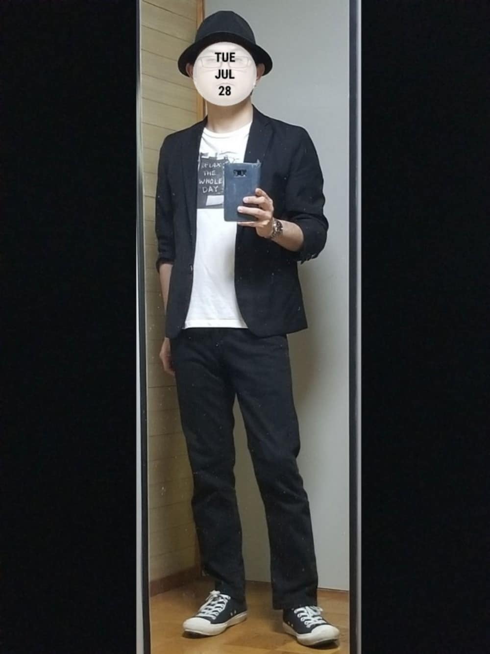 おはようございます🙋 7分袖のテーラードジャケットに白のプリントシャツ 足元はスニーカーにしてカジュアル感をだしました