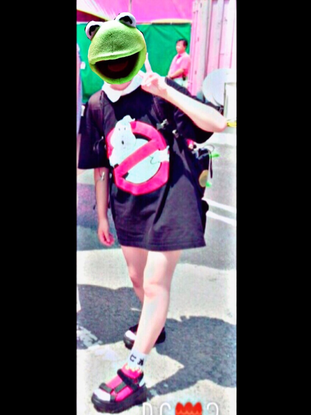 お気に入りのゴーストバスターズのデカTシャツをワンピース風に付け襟つけて着てみました🐸