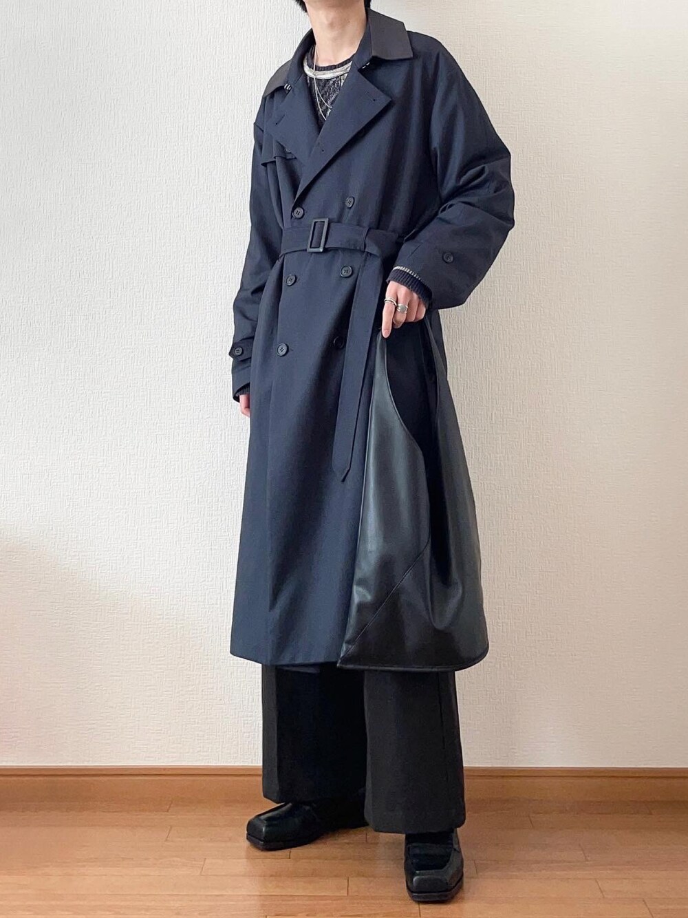 トレンチ閉めて着るのハマってます 中性的な感じ出ていいよね
