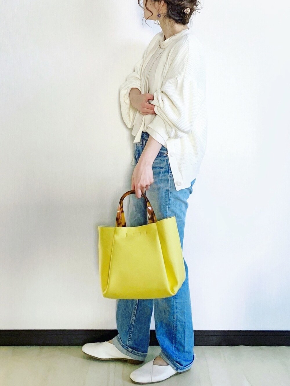 sHimA*kOのカーディガン/ボレロ「ワッフル編みVネックカーディガン」を使ったコーディネート
