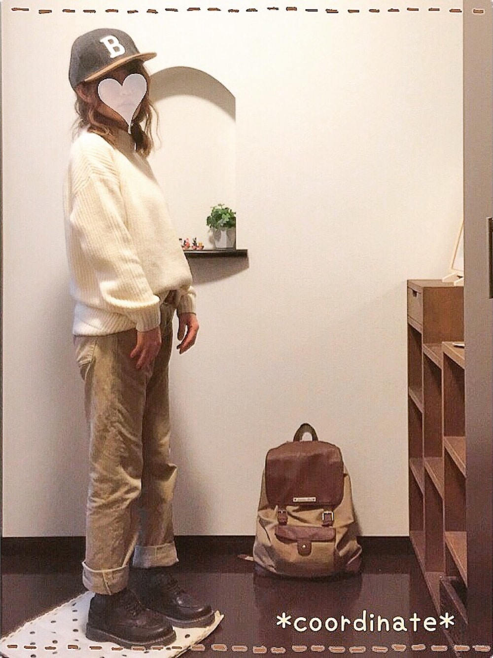 *coordinate* ・ニット:GU ・パンツ:GU ・キャップ:しまむら ・靴:Rin clover ・リュック:SM2 キャップが主役の シンプルコーデ⑅◡̈* ✏--------------------.