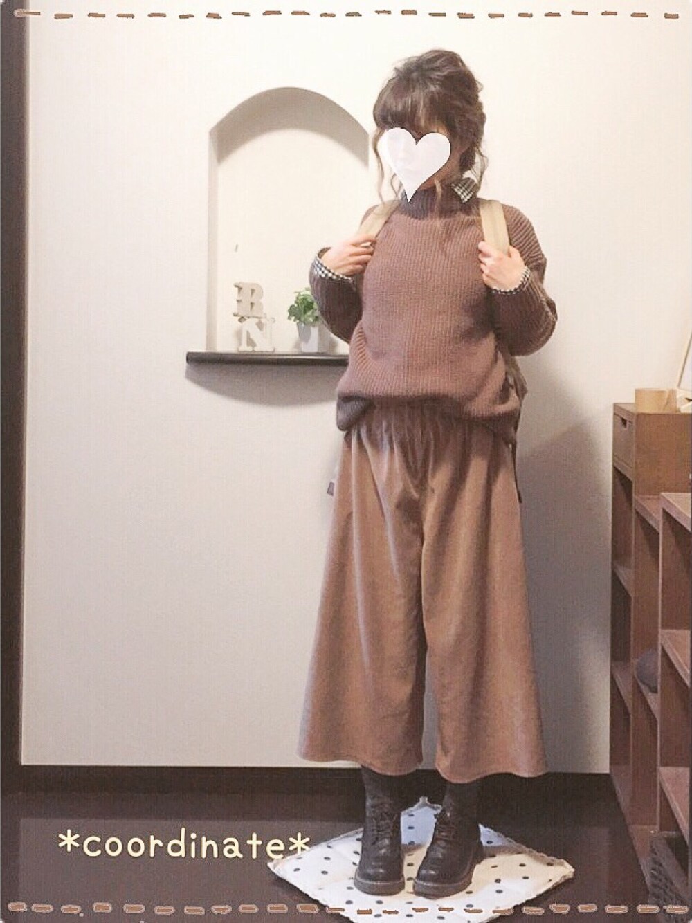 *coordinate* ・ニット:GU ・チェックシャツ:UNIQLO ・ガウチョパンツ:しまむら ・リュック:SM2 ・靴:Rin clover 茶系でまとめた ワントーンコーデ⑅◡̈* ✏--------------------.