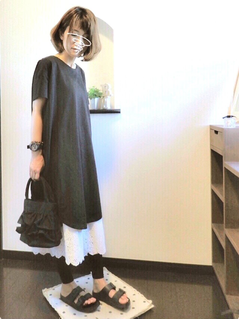 *coordinate* ・ワンピース:samansamos2 blue ・スカート:samansa mos2 ・サンダル:nano universe ・バッグ:しまむら モノトーン のシンプルコーデ ❀ 一目惚れしたしまむらの フリルトートは 1,200円でした *ノ∀`* ✏--------------------.