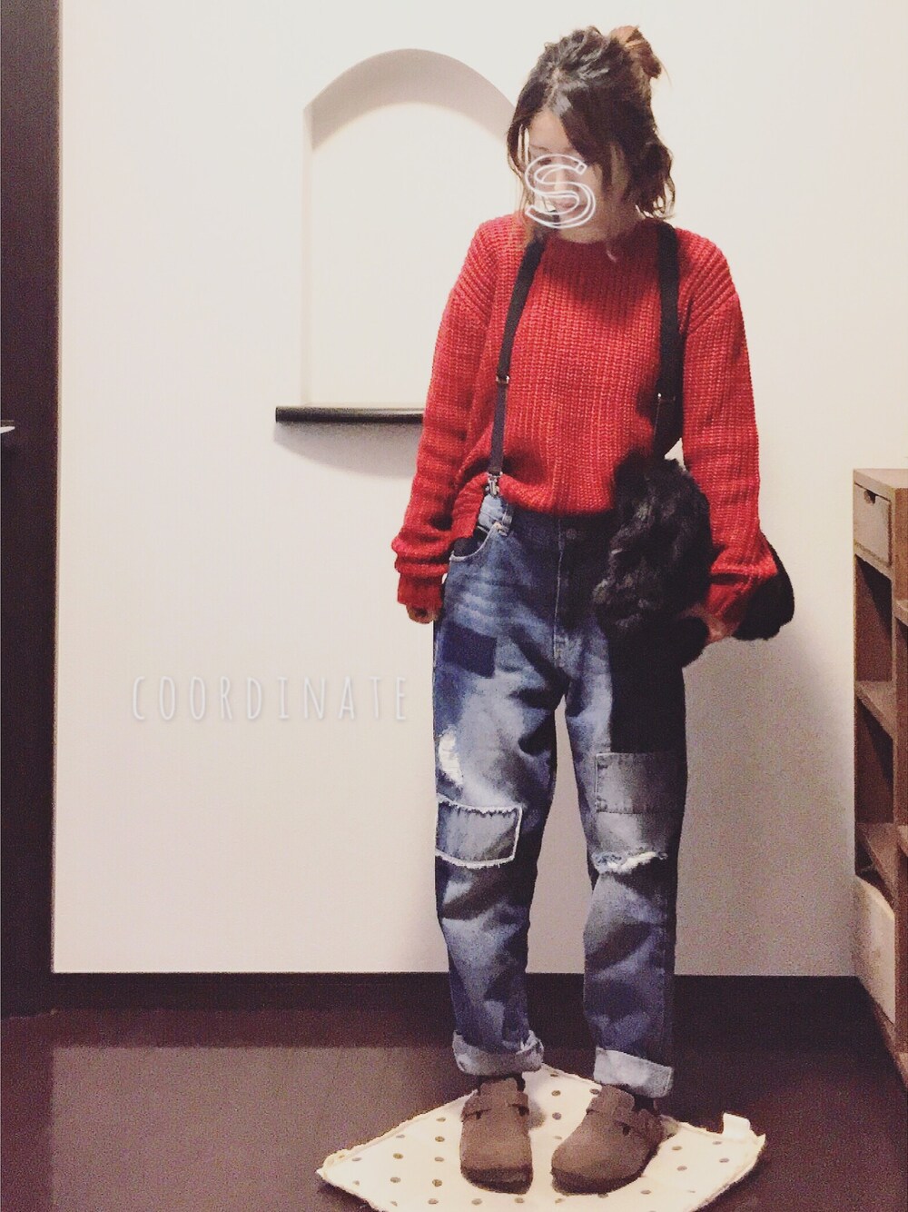*coordinate* ・ニット:DAISY MERRY ・ジーンズ:no brand ・サスペンダー:BEAMS BOY ・バッグ:E hyphen world gallery ・靴:BIRKENSTOCK 赤ニット が主役の ゆるカジ こーで ₍ᐢ⸝⸝› ̫ ‹⸝⸝ᐢ₎ ✎ ----*----*----*----*