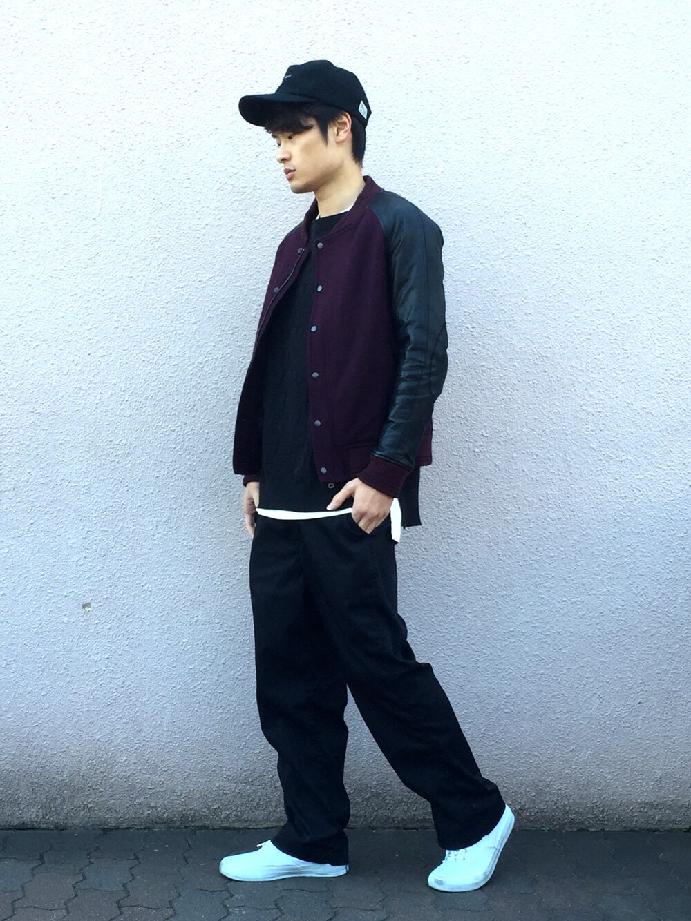 スポーツミックスコーデ スタジャンのワインレッドがお気に入り