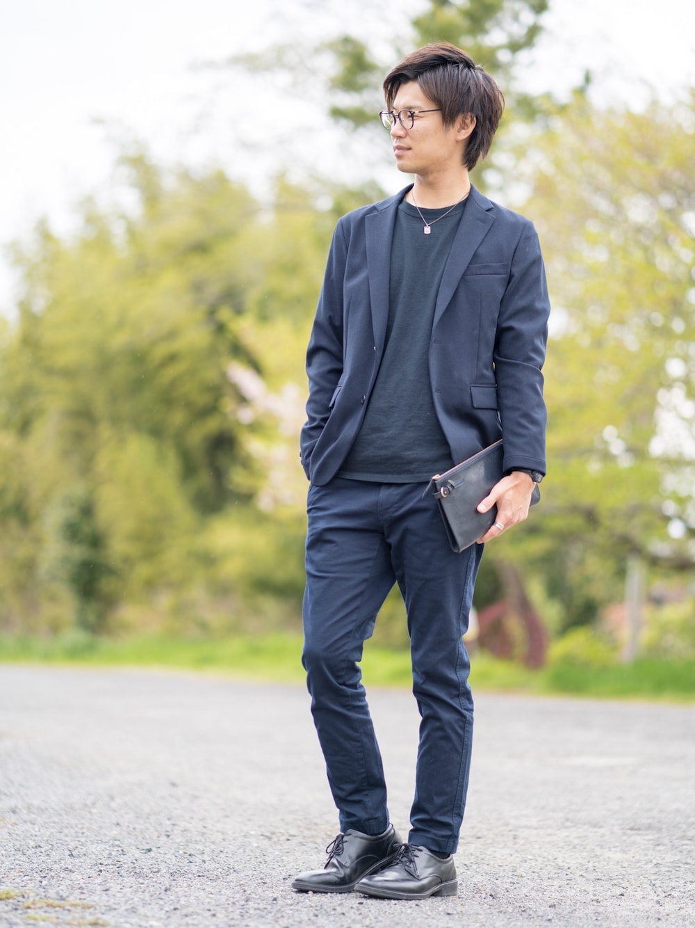 こんにちは! ピックアップタグに便乗してセットアップ じゃなくてセットアップ風! ネイビー×ブラックって良い感じにシックになるから好き🧐 真っ黒は一歩間違えるとホストみたいなるからね🤣