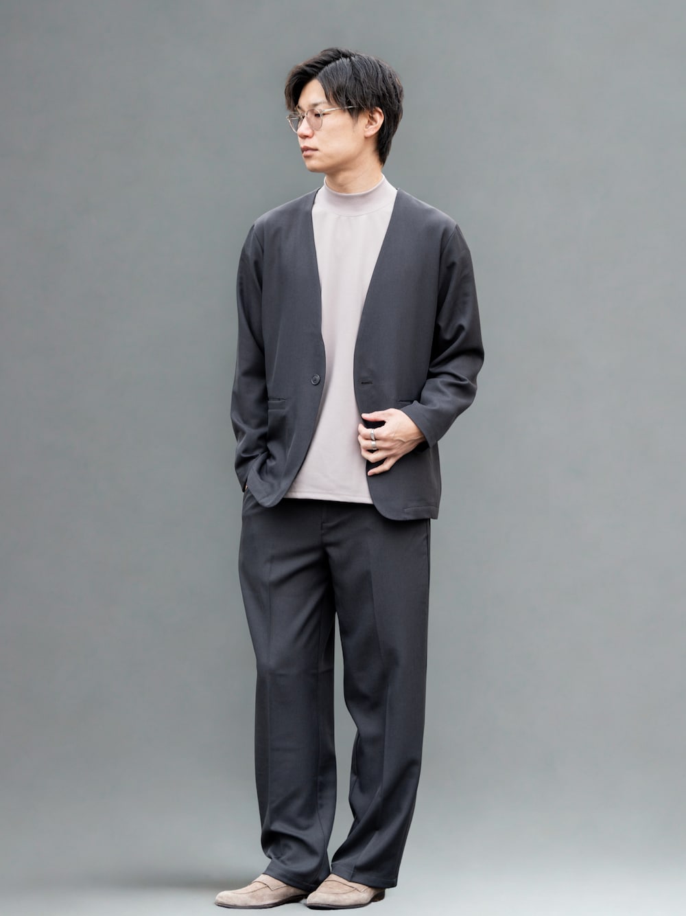 Ryu--taのセットアップ「【EASENCE】パウダーツイル セットアップ ノーカラージャケット&ワイドパンツ<イージードライ/マシンウォッシャブル>」を使ったコーディネート