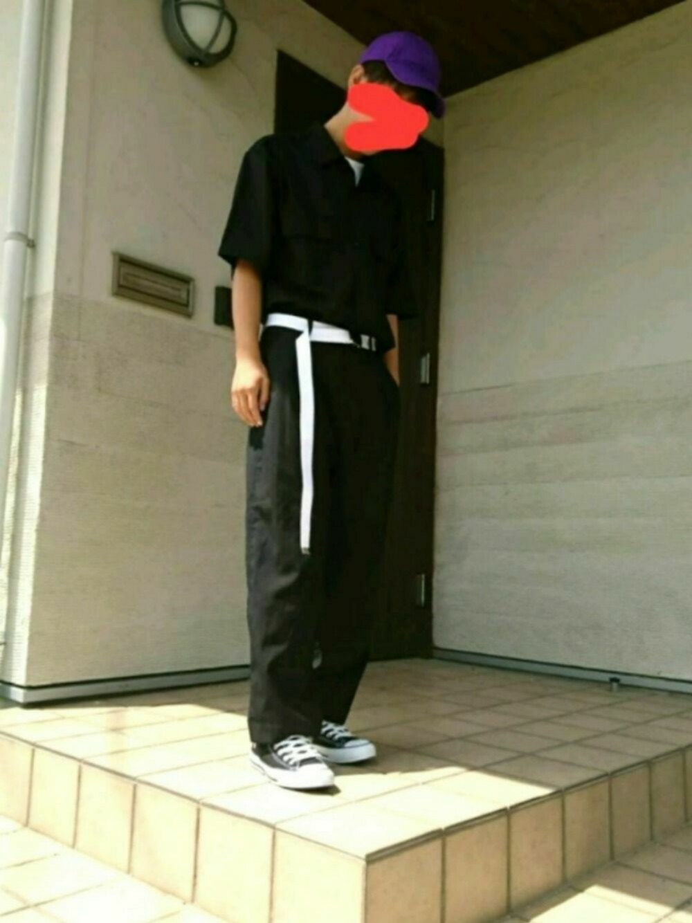 ワイドパンツにオープンカラーシャツをタックインしてみました! 黒と黒との間に白のガチャベルトをしたことによっていいアクセントになりました☆ キャップはパープルにして人と被りにくいコーデにしてみました!