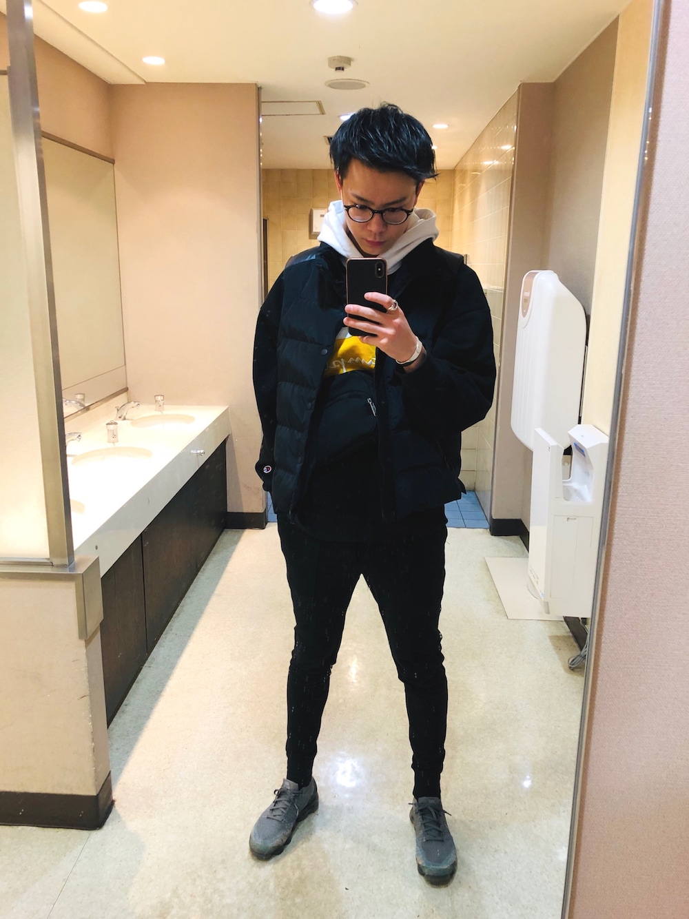 投稿見ていただいてありがとうございます 最近頑張って投稿するようにしてます🔥 本日は暖かいので滅多に着ない パーカーを着てみました🔥 夜寒いみたいなのでダウンベストで 防寒対策🌈 NIKEの靴同じの履いてる人見たことない からすごい嬉しい😂😂