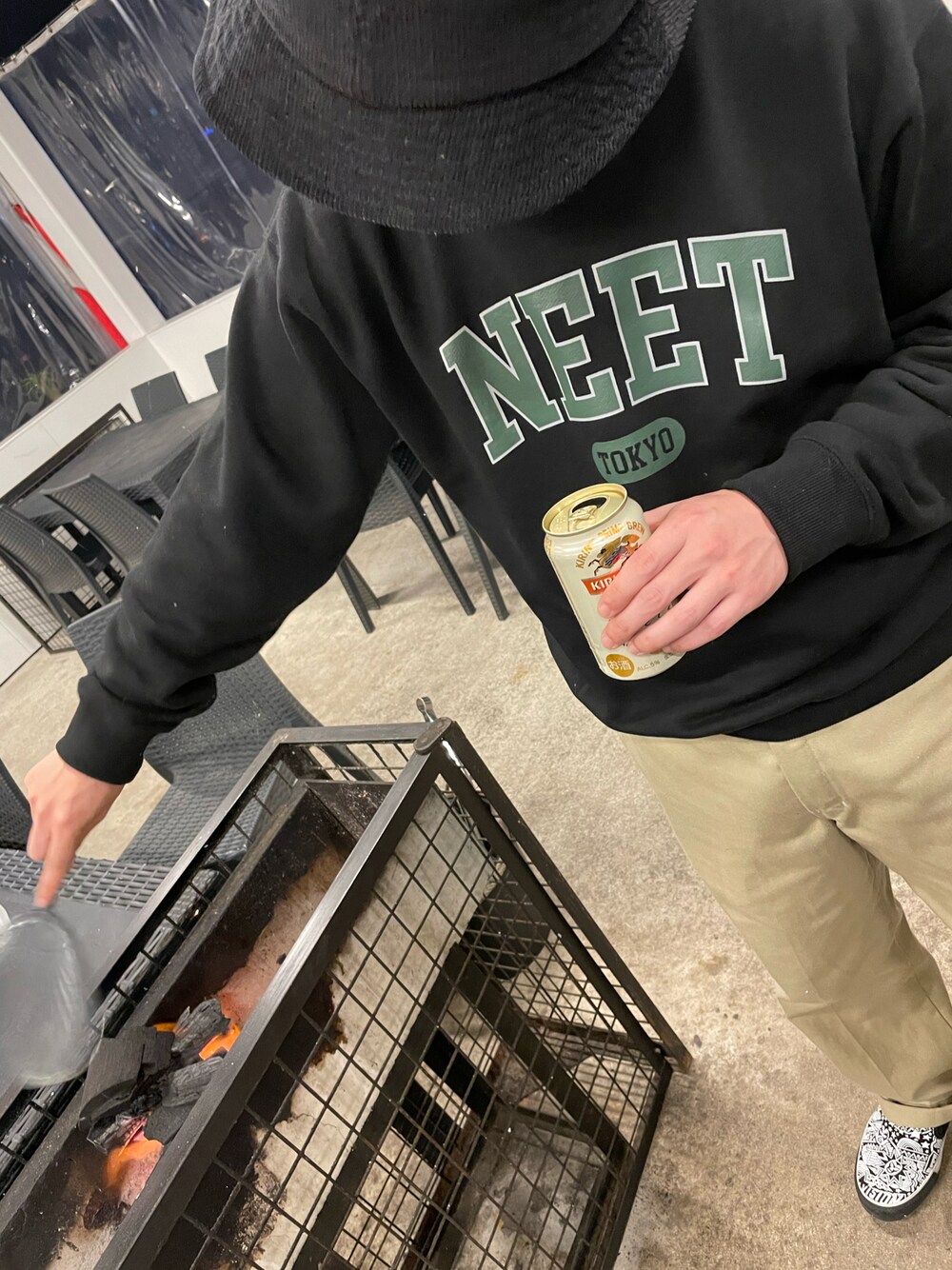 今日少し暖かくてスウェットだけでBBQスタートしたけどやっぱ夜は寒いなコーデ