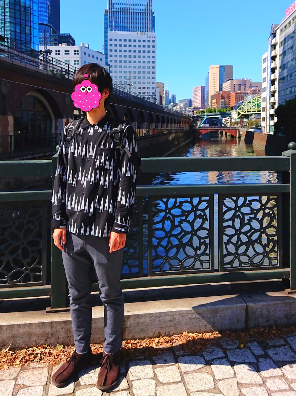 冬が近づいた晴れた秋の日らしく、落ち着いた色合いで締めました。 そんな中、シャツの柄が効いています。効いてると思ってます。