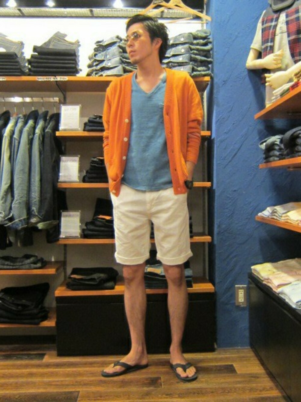 4色以上の色を入れてのサマーコーディネートに仕上げてみました。 Tシャツにショーツ、ビーチサンダルといった完全夏スタイルにカーディガンを入れるだけで 夕暮れの肌寒い時間など対応出来て重宝しますよ。