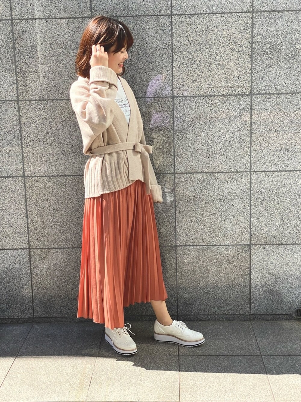 肌寒い日に一枚もっておきたい ニットカーディガン🧶 . アシメトリーのプリーツスカートを 温かみのあるカラーにする事で 春コーデに✨ . . 綺麗めシューズと合わせても スニーカー合わせでも◎