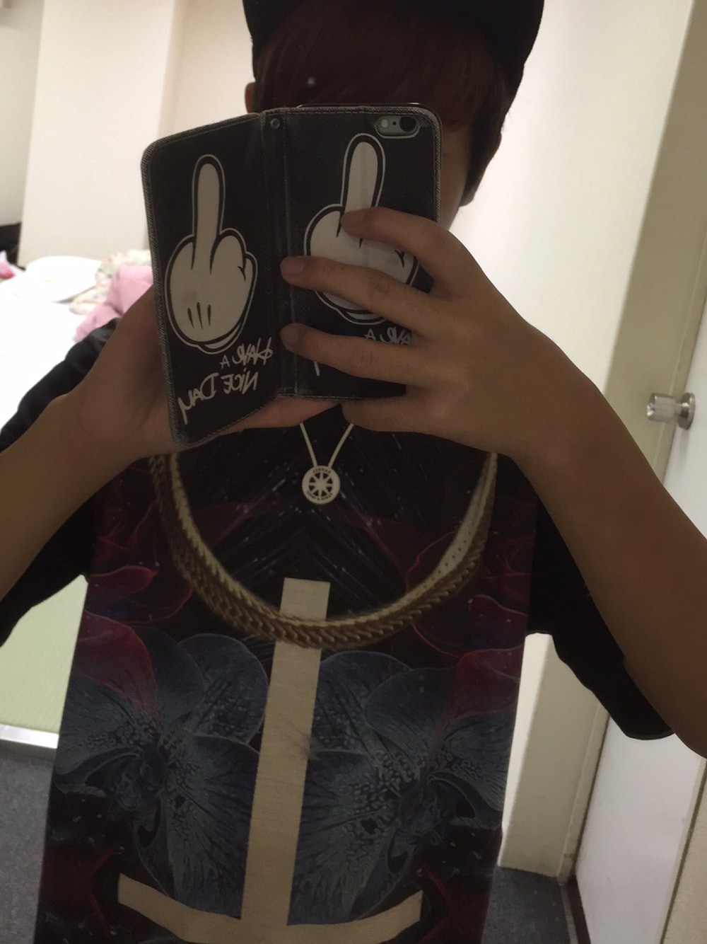 大阪なう😁 大阪の宿泊先にて撮りました👍 先日アメ村でかったSPACE9のロングプリント柄シャツに写ってませんが黒スキニーでYシルエットで足を細く見える効果😳 そしてシンプルでモノトーンのBANDELのネックレスをチョイス!そして安定のno brandのキャップ😎笑笑