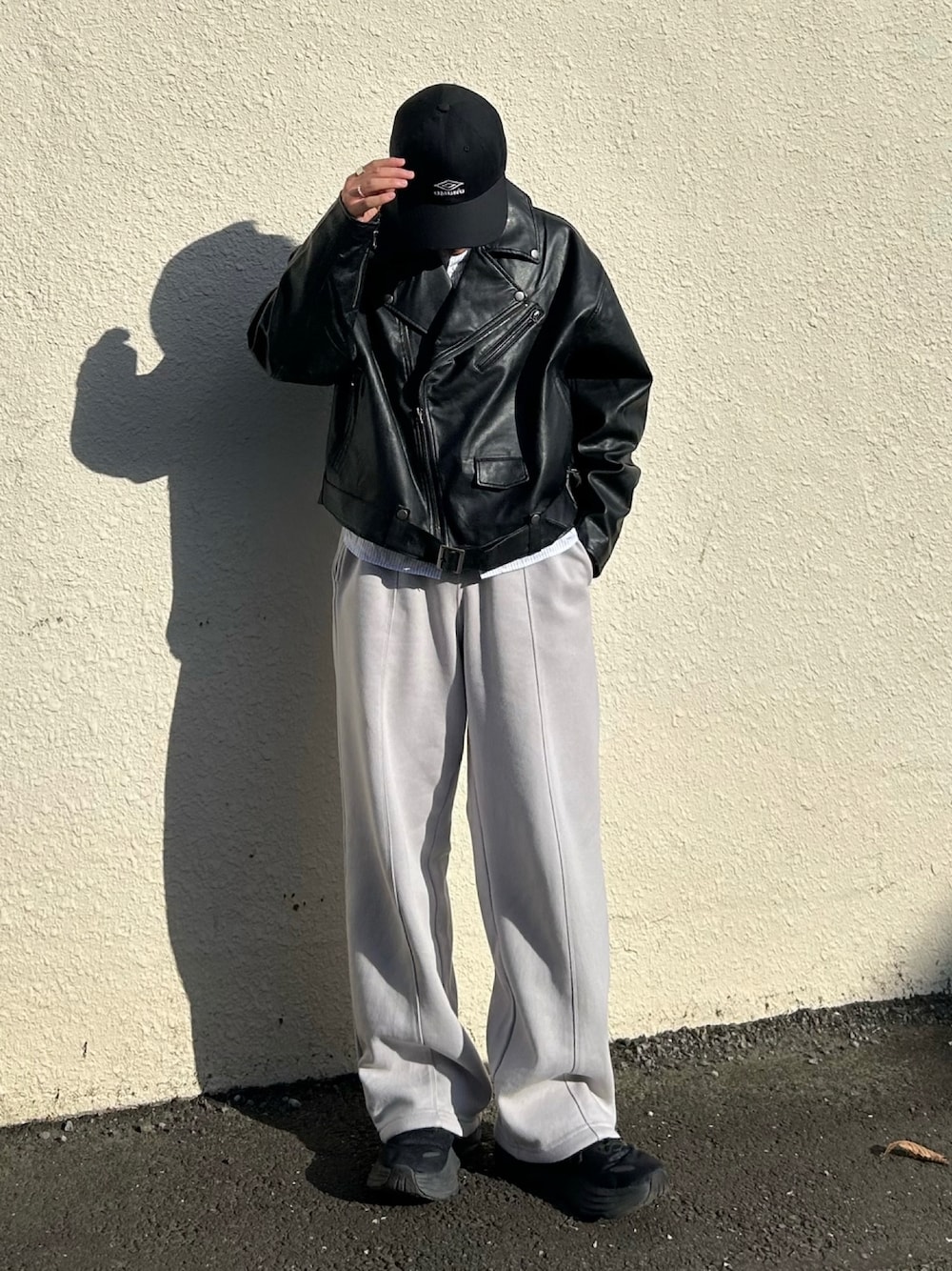 スウェットと、短丈のレザージャケットを合わせたカジュアルなスタイリング。 スニーカーにスウェット、キャップとカジュアルなアイテムを使ってる中に、男らしいレザーのジャケットと上品なストライプシャツを入れてあげると、カジュアルながらも上品なスタイリングになると思います。