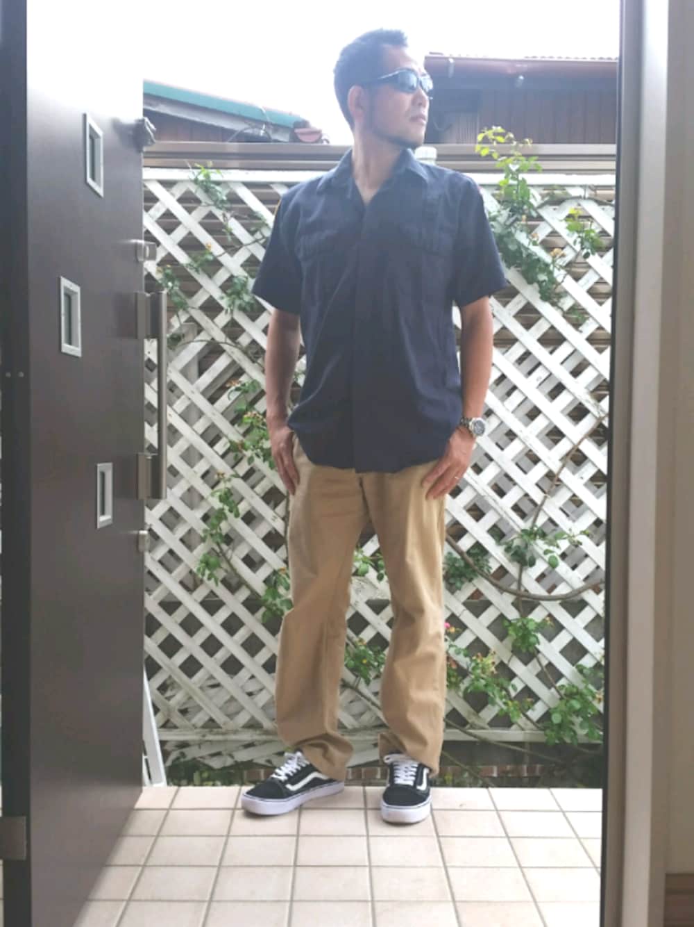 おはようございます😀いつも閲覧くださいましてありがとうございます😃 今日のコーデは、ネイビーのワークシャツにチノパン、バンズをあわせたシンプルなアメカジコーデです😎 今日朝のコーデで、憧れのリー先輩がネイビーのオープンカラーシャツきていて、先輩のコーデに近づくチャンスだったので、真似させて頂きました😍 りーさんさんのファンの皆様、似てね〜wwって心で思われても、クレーム入れないでくださいねww コワオモテでもメンタルは、ガラスです(笑) でもいつもコメントくださるお仲間の皆様好きなようにツッコんでください😆😆😆お待ちしてます(笑) 小窓からリー先輩が見てる😍あっ目があったらどうしよう?😁 あっサングラスしてるから目が合わないんだったww😂
