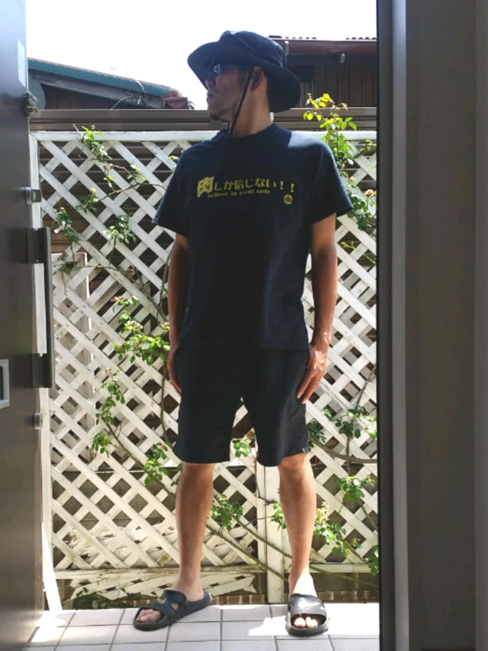 いつも閲覧くださいましてありがとうございます😀 今日は、天気が良いので、家族と親戚を呼んで庭でバーベキューをしようかと思ってます🍖 この間買ったばかりのノースのホライズンハットサンダル、ハーフパンツ、Tシャツ、サングラス、すべて黒で合わせてみました😎 Tシャツは、バーベキュー好きの友人から頂いたもので、肉しか信じない‼って書かれてます(笑)背中に大きく肉って書かれているので、海でバーベキューするときは、いつも着ています。お酒が回ってくると、知らない人から声をたくさんかけられるので、ウケ狙いで着るにはなかなか優秀なアイテムです(笑)😆😆 それでは皆さん良い日曜日をお過ごしください😃