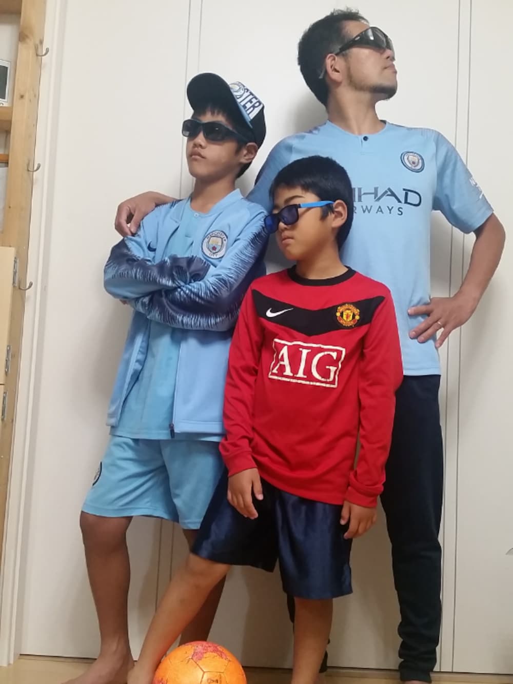 いつも閲覧頂きありがとうこざいます😃 今日のコーデは、サッカーユニフォームコーデです😀 実は、私のお友達のあっくん👿が、大のサッカー好きでよくサッカーユニフォームのコーデをアップしています。いつかあっくんとコラボしたいなぁと思っていたのですが、あっくんが快くコラボしてくれました😁 👿あっくんありがとう。 本当は、プレミアリーグのマンチェスターダービーと言ってマンチェスターを本拠地とする2チームが対戦するコラボをする予定でした。 あっくん👿は、マンチェスターユナイテッド、りゅうぞう😎は、マンチェスターシティで行く予定で準備をしていたのですが、急きょ長男がマンチェスターシティでコラボしてくれる事になりました😄 何枚か写真を撮っていたら、次男が、「マンU一人に対してシティ二人は、ずるいよ!」と言い出した為、次男が、あっくん側のマンチェスターユナイテッドで参戦することになりました😀 今日のユニフォーム 🇬🇧マンチェスターシティとマンチェスターユナイテッド ちなみにマンチェスターシティのレプリカのユニフォームは、デブライネです😁 デブライネは、ご存知の方が多いと思いますが、ロシアワールドカップで日本を破ったベルギー🇧🇪の司令塔。 長男は、ワールドカップの日本対ベルギーの試合で、デブライネに惚れ込んでしまいました😍非国民です(笑) 三人でサッカーの練習をたまにするのですが、必ず練習メニューにベルギーの決勝点となった高速カウンターを練習させられます😅 嫁は、クルトワ、長男は、デブライネ、次男は、シャドリ、私はいつもルカクをやらされています😆 この話をあっくんにしたところ、あっくんの投稿のサングラス大国の自己紹介欄で、私の写真がルカクに変えられてしまいました😁(笑)これを見たりーさんは爆笑していました(笑) 長々と書いてしまいましたが、あっくんのお陰で、あっくんとコラボも出来て、親子のコラボも出来たのでとても記念になるコーデができました😉 あっくん👿いつもありがとう。 それでは皆さん楽しい一日をお過ごしください🤗