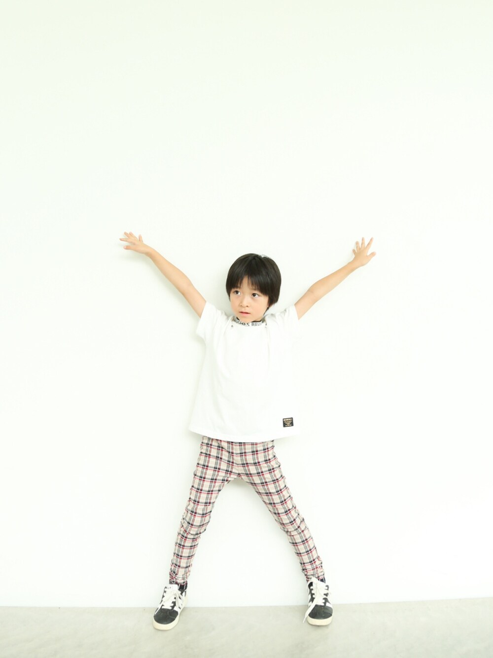 122cm 130サイズ チェックと白のコーデで夏から秋への移行中