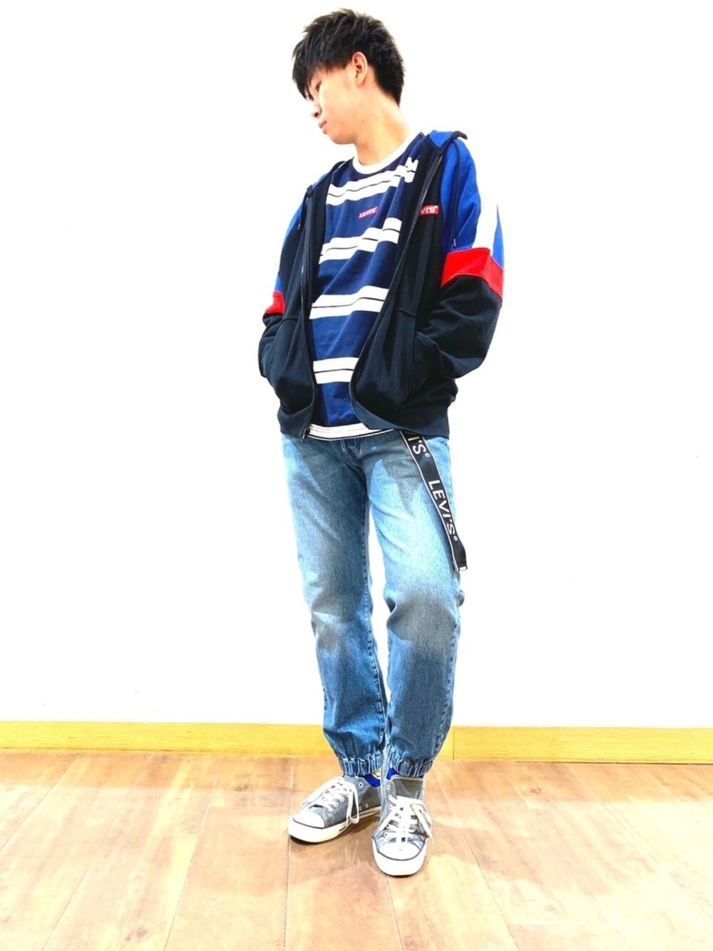 初投稿です!(^^) LEVI’Sジョガーパンツとパーカー組み合わせによりオシャレ+日常的なラフさを演出した学生オススメコーデです!