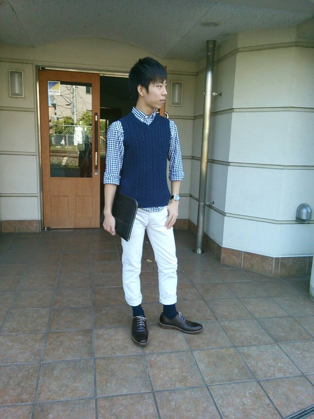 ギンガムチェックシャツを使った春夏コーデになります。 ネイビーのニットベストは色の効果で細身に見えてカッチリしがちなので、チェックでカジュアルダウンしました。 ギンガムチェックと白ボトムを活かすためにネイビーのベストとソックスで色みを落ち着かせて、キレイ目にしました!また革靴は敢えて黒ではなくブラウンにしたことで少し上品な感じになるようにしてみました。 シャツ、ソックス、シューズを安物で揃えました。 Knit vest: Beams plus ¥ 8500 Shirt:無印良品 ¥3000 Botms: Levi's 511 Bedford cord ¥8500 Socks : 無印良品 ¥300 Shoes: Stefanorossi ¥10000 Watch : Emporio Armani 今日は母の日でしたので、母にはカサブランカをプレゼントいたしました。喜んでもらえて私も非常に嬉しかったです(*^-^*)