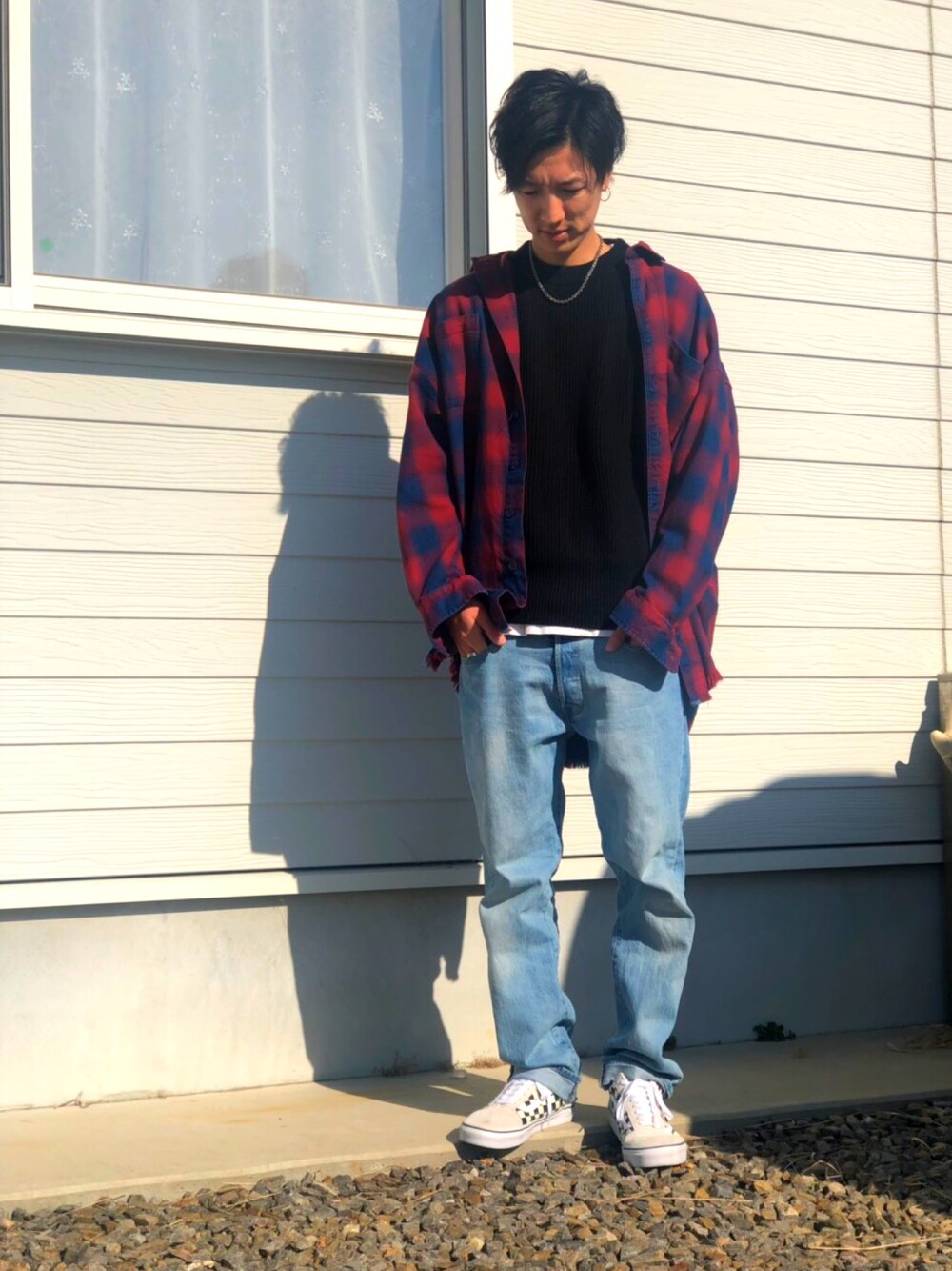 この前購入した、GUの黒ニットを使用 インナーが厚手なので、アウターにシャツを デニムは薄いブルーで、全体的に明るい印象に スニーカーはVANS