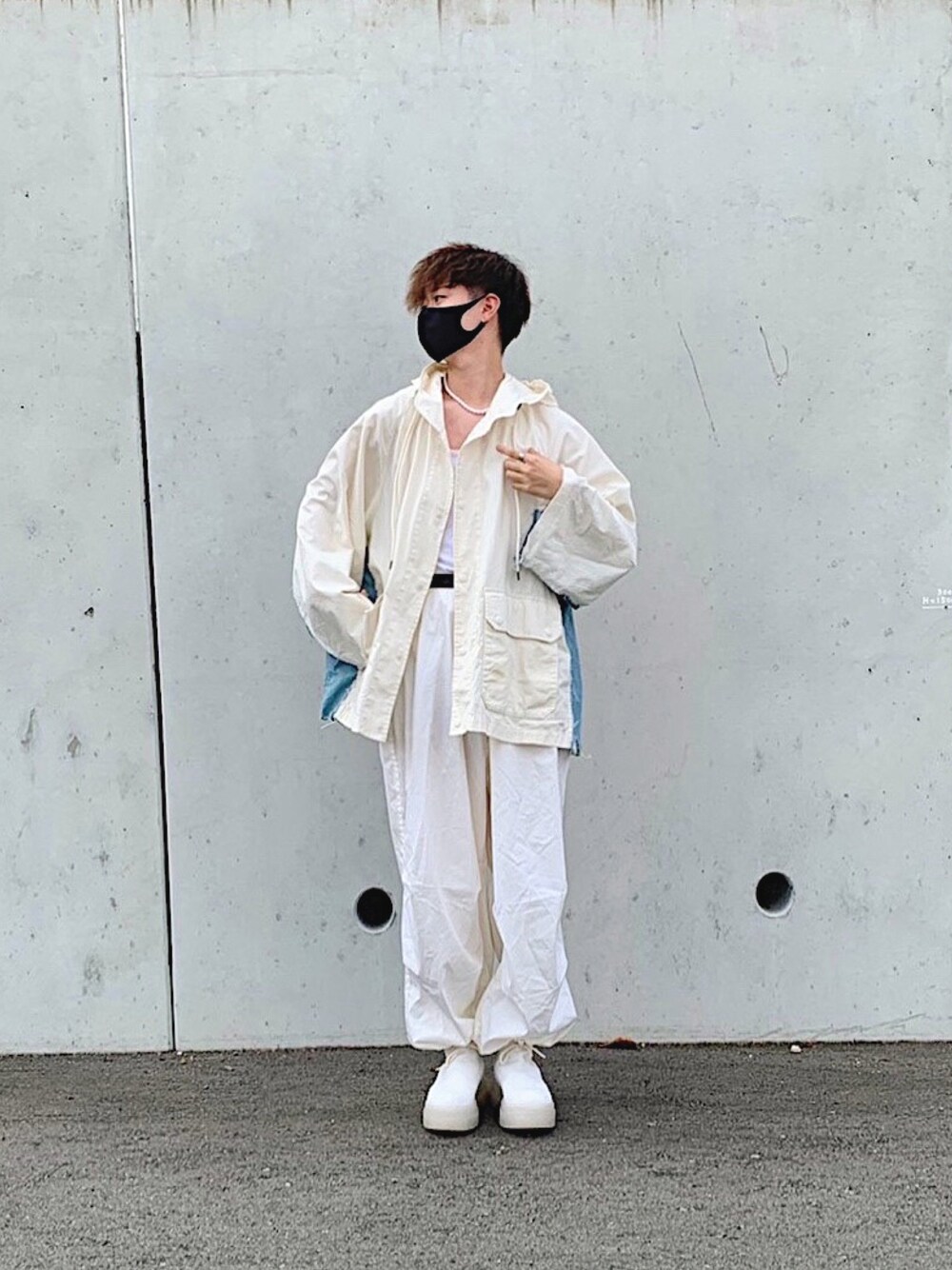 全身ホワイトコーデ アウターはユニクロのスノーパーカーをリメイクしてみました 中はタンクトップでタックインをすることでスタイルを良く見せることができます