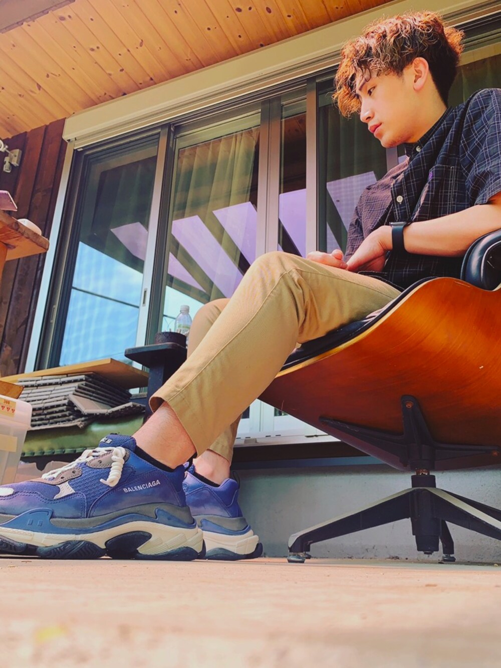 夏場のワンシーン。 足元のバレンシアガでアクセント。