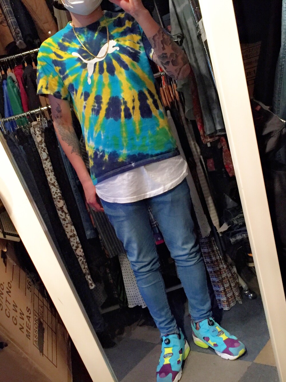 完全夏ファッション🌴🌴🌴 タイダイの柄が欲しくて 原宿の古着屋で見てたらプーマ可愛すぎて即買いっっ😂😂 しかも1000円😋♪ ポンプちゃんとの相性も◎◎