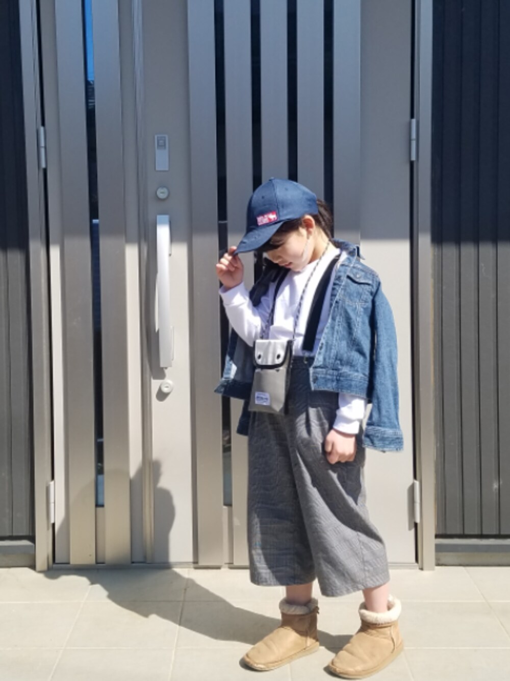 帽子は無地の帽子にワッペンをくっつけた自作です! 小学生ながら清潔感と遊び心があります! ブーツのうえをひっくり返してボアを見せるなど、自分で考えて履いているようです😁