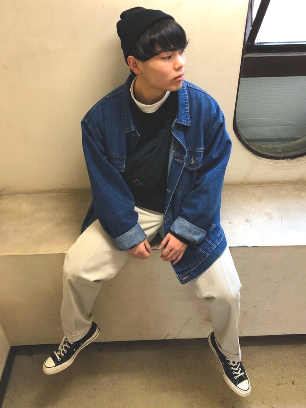友達の家の階段で撮影しました。 全部古着でコーディネート。 ベージュっぽい白系のパンツなかなか可愛いです。 友達@anagosan0524