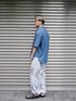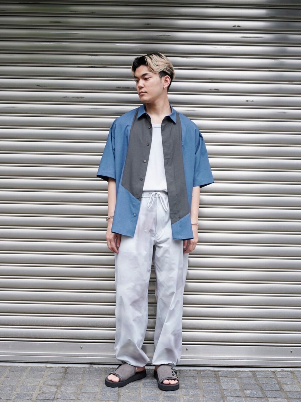 前面にアシンメトリなデザインを施したシャツ。ボタンを閉めて一枚でスタイリングや羽織としてスタイリング出来ます! パラシュートパンツと合わせてカジュアルにスタイリングしました。