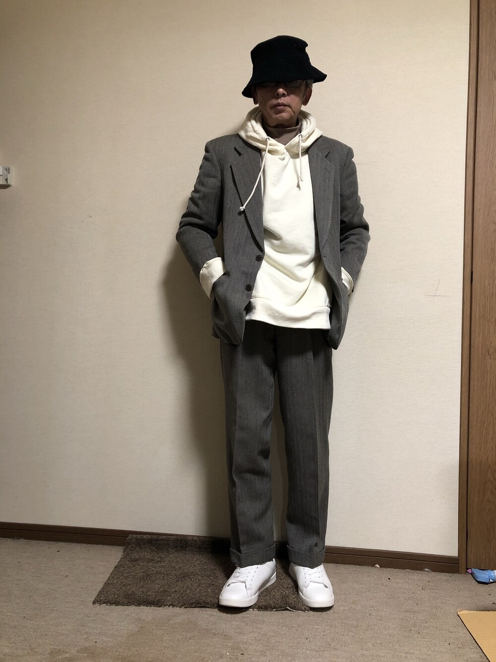 メルカリで入手したレトロ感のあるオンワード樫山 イブサンローランの中にパーカーを入れてみました。