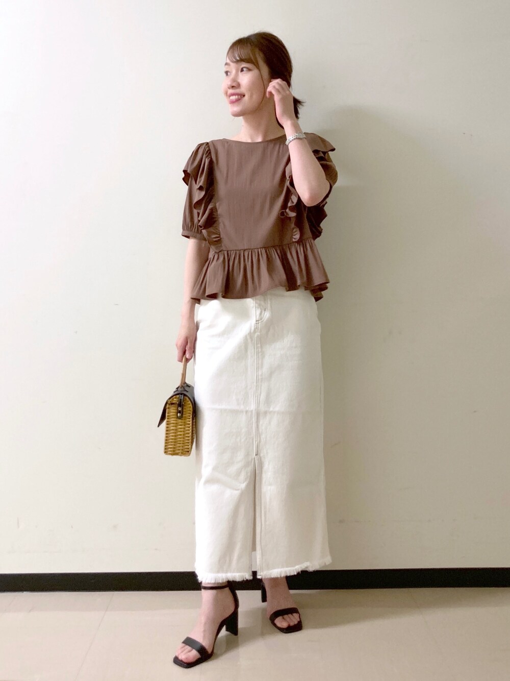 フリルデザインブラウスは、デニムスカートで甘さを軽減🥰 黒の小物で大人っぽく💐