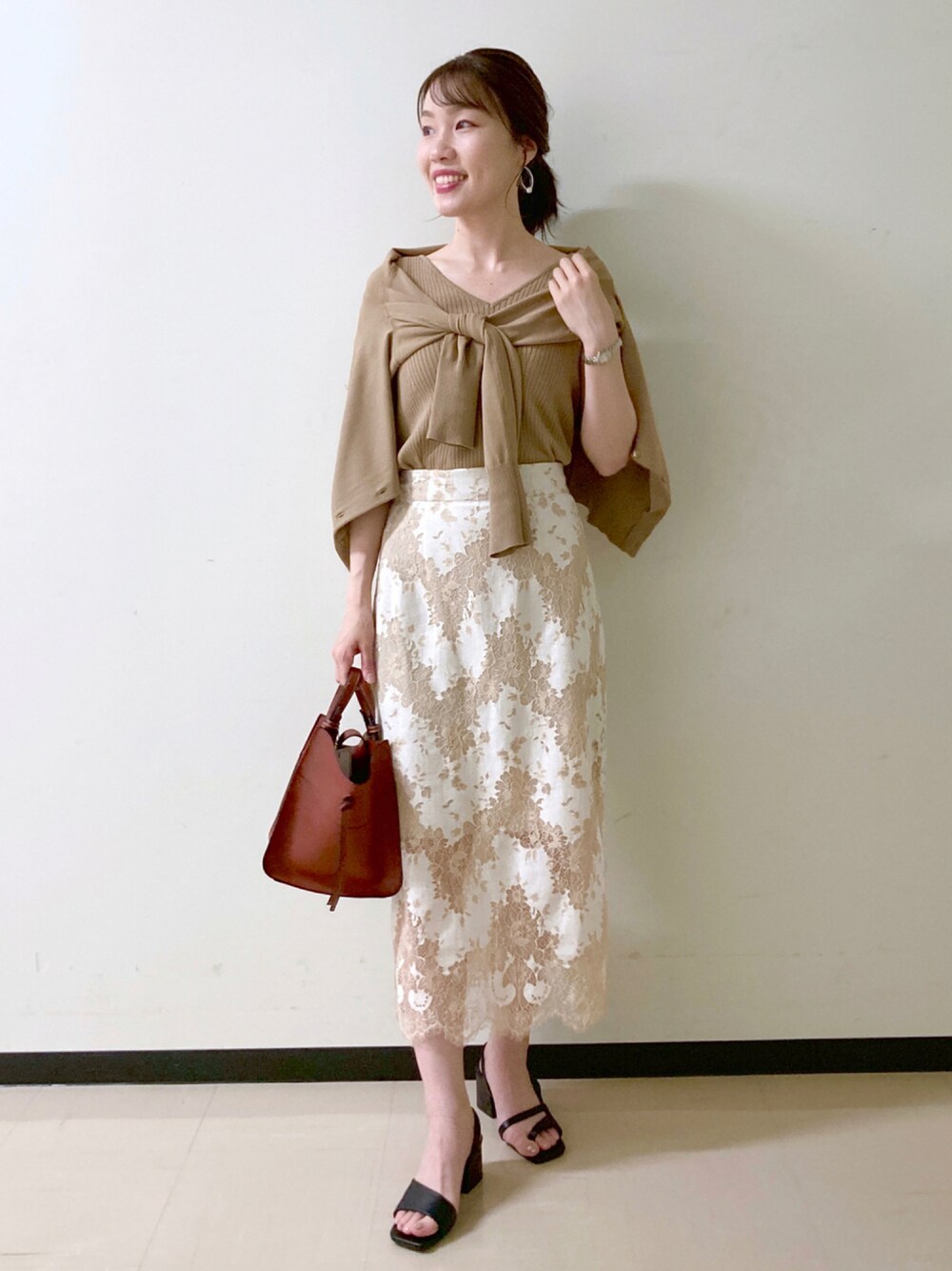 ベージュでまとめたお仕事コーデ🌿 UVカット&ウォッシャブルのカーディガンは、アンサンブル対応のアイテムで、かっちりしたお仕事用にも人気です☺️✨ レーススカートはきちんと感と涼しさを両立してくれます💐