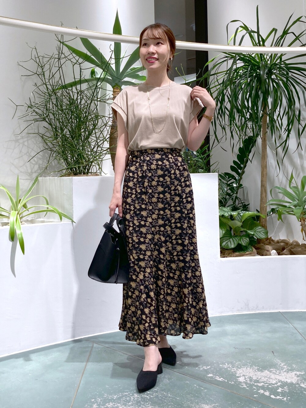 マーメイドスカート×Tシャツで大人カジュアル🥳 シルエットがきれいなマーメイドスカートは、ブラウス生地で軽く、シワになりにくくて嬉しい🥰 まだまだ暑いので、Tシャツを合わせて。 小物をブラックでまとめて秋感を🍁