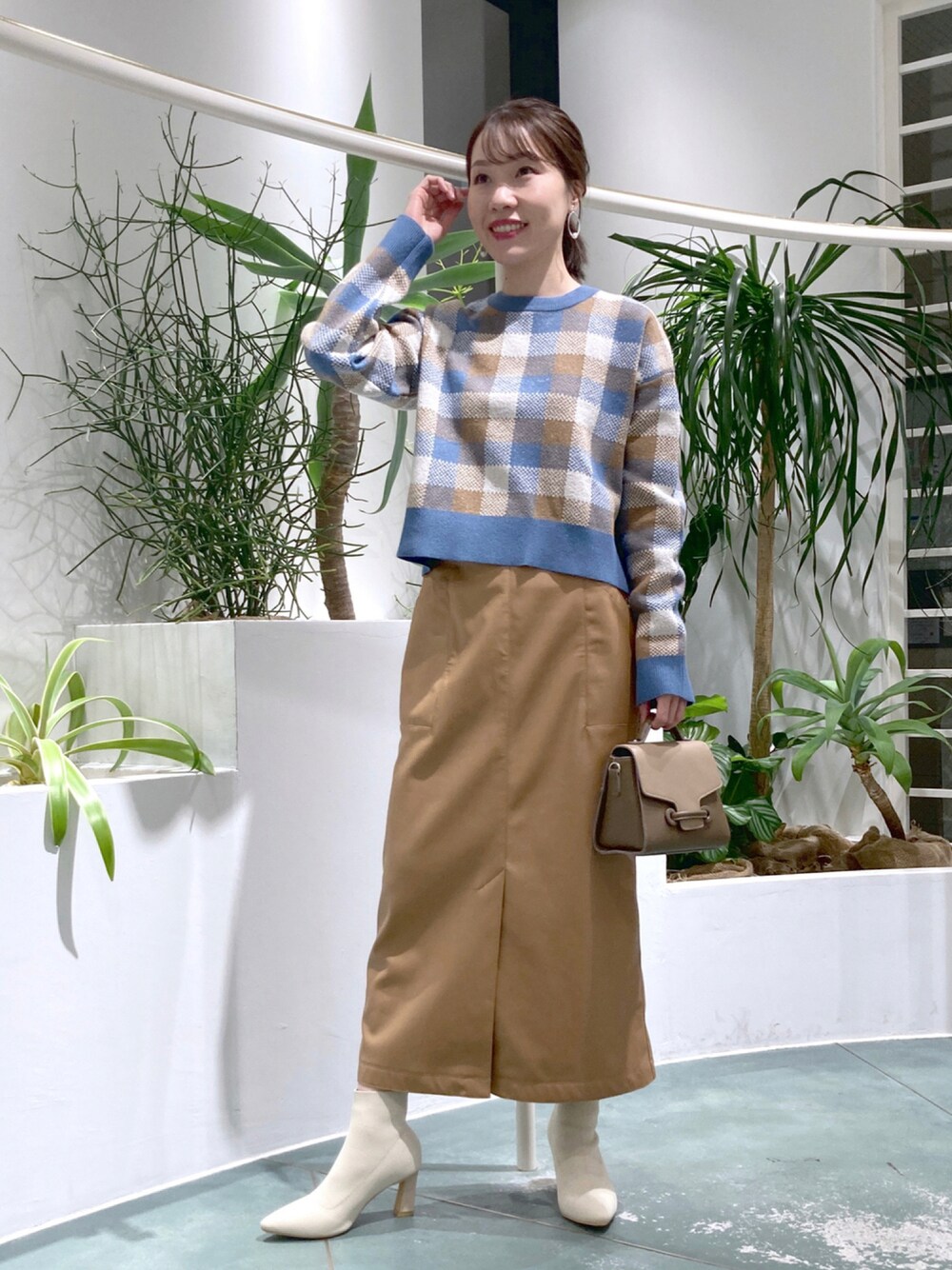 チェック×レザーの女子会コーデ✨ トレーナー感覚で使えるチェック柄のニットは、ブルーが人気No.1👏 レザースカートと合わせてトレンド感を。 ベージュやアイボリーの小物で女性らしさを演出💐