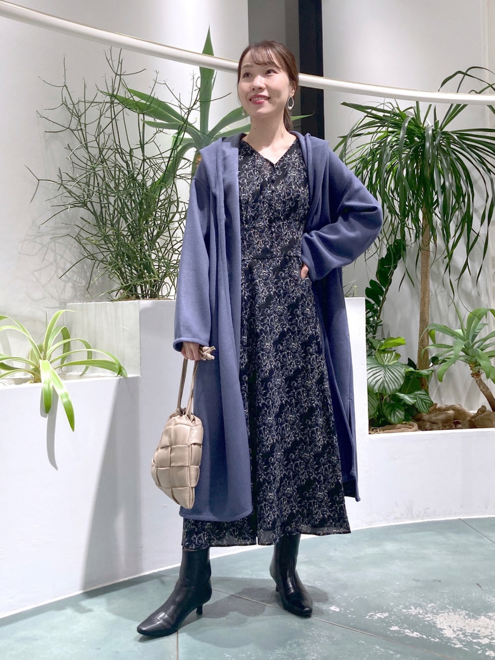 ブルー×ブラックの大人配色🫐 定番の花柄ワンピースも、ブルーのアウターを羽織るだけで新鮮さが増します✨ 可愛らしい花柄も、大人っぽい印象に🥺