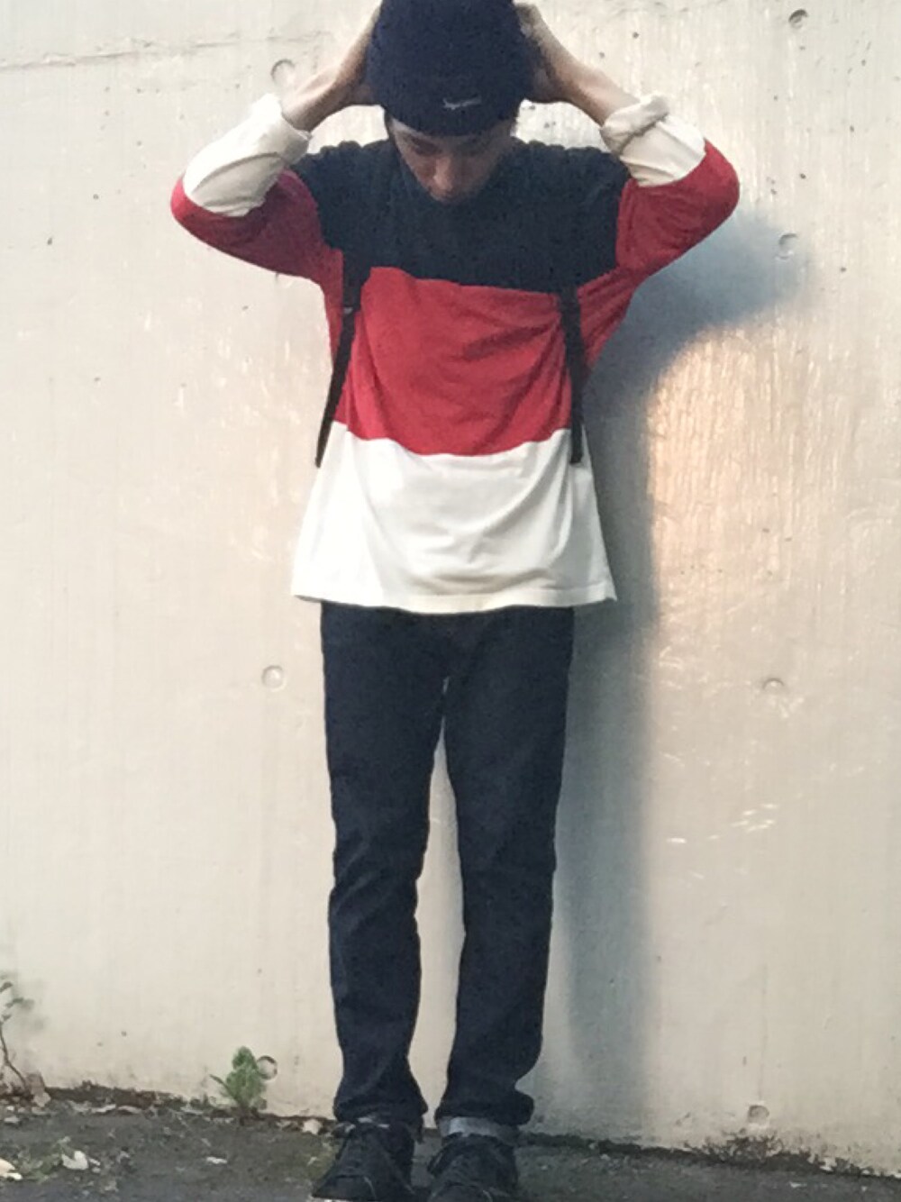 ロンT、デニム、スニーカー、ニットキャップ 自転車なんでダラダラゆるゆる。