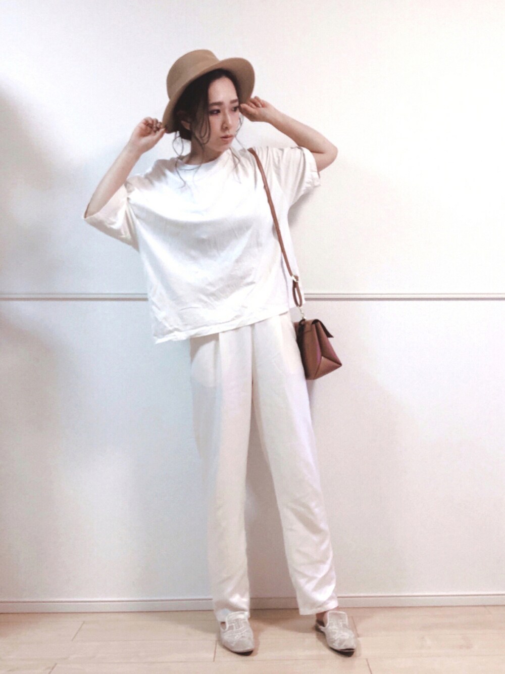 上下オフホワイト☁*° 緩めなシルエットでイージーなコーデ☁️💭 サテンのように艶やかパンツがとっても可愛い。・:+°