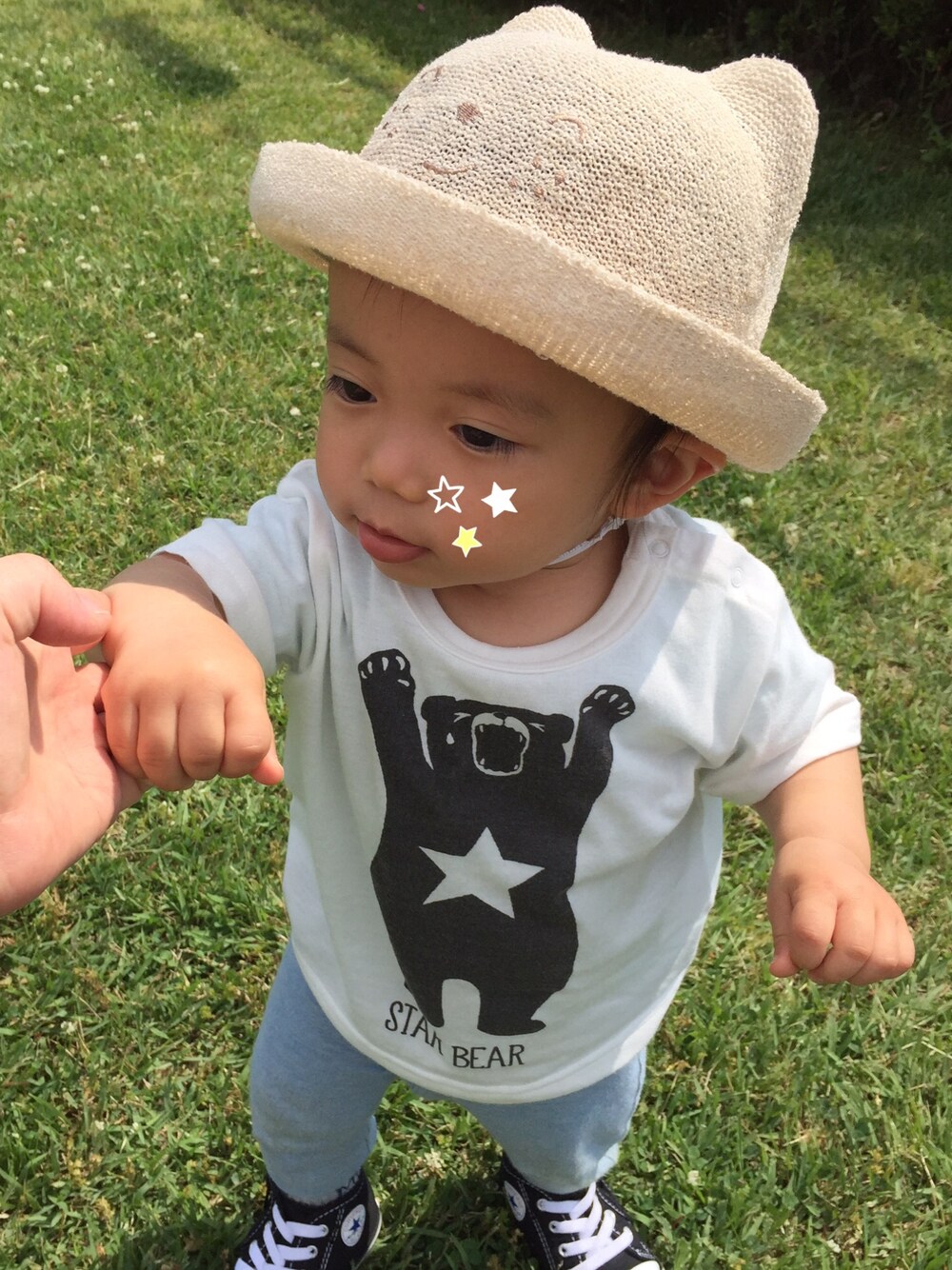 あくびしてるクマくんのTシャツ😆 帽子は女の子用かな?だけど、一目惚れ😊最近はこれをよくかぶってお散歩行ってます! 芝生で歩く練習してきました〜☆
