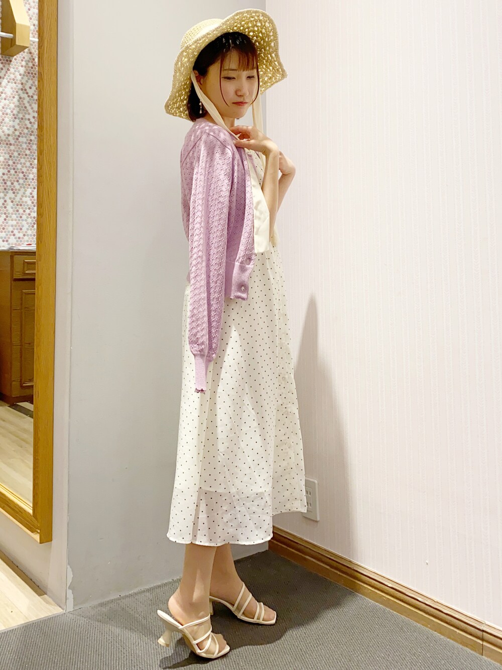 . . 白ドットワンピースに AreeamのLvenderカーディガンを 差し色で入れたガーリーコーデ🎀𓂃 𓈒𓏸 足元は涼しげなサンダルで夏らしく🫧 . .