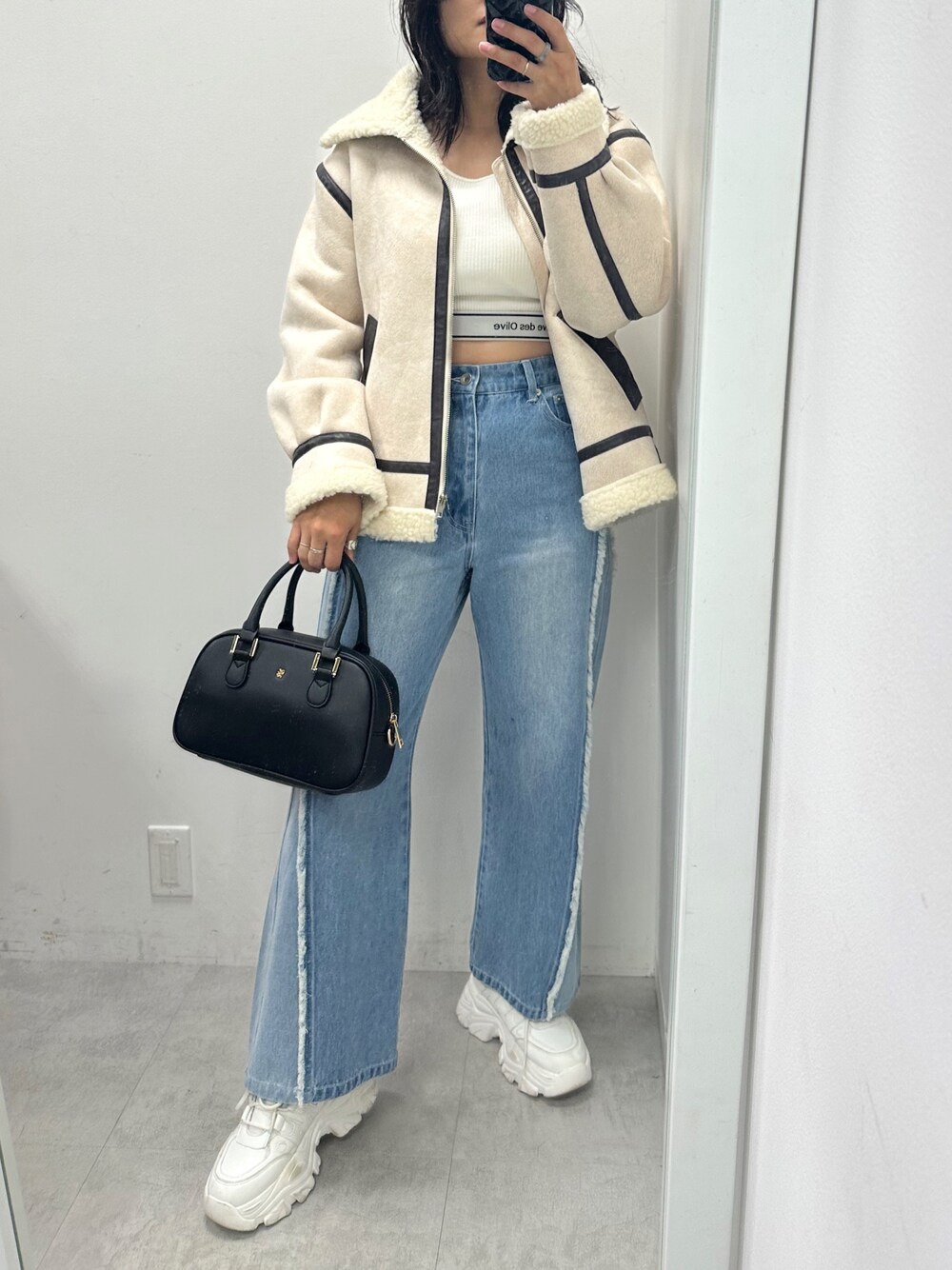 s13_olive(OLIVE des OLIVE)のライダースジャケット「【WEB限定】ヴィンテージ風フライトジャケット 1032070040」を使ったコーディネート