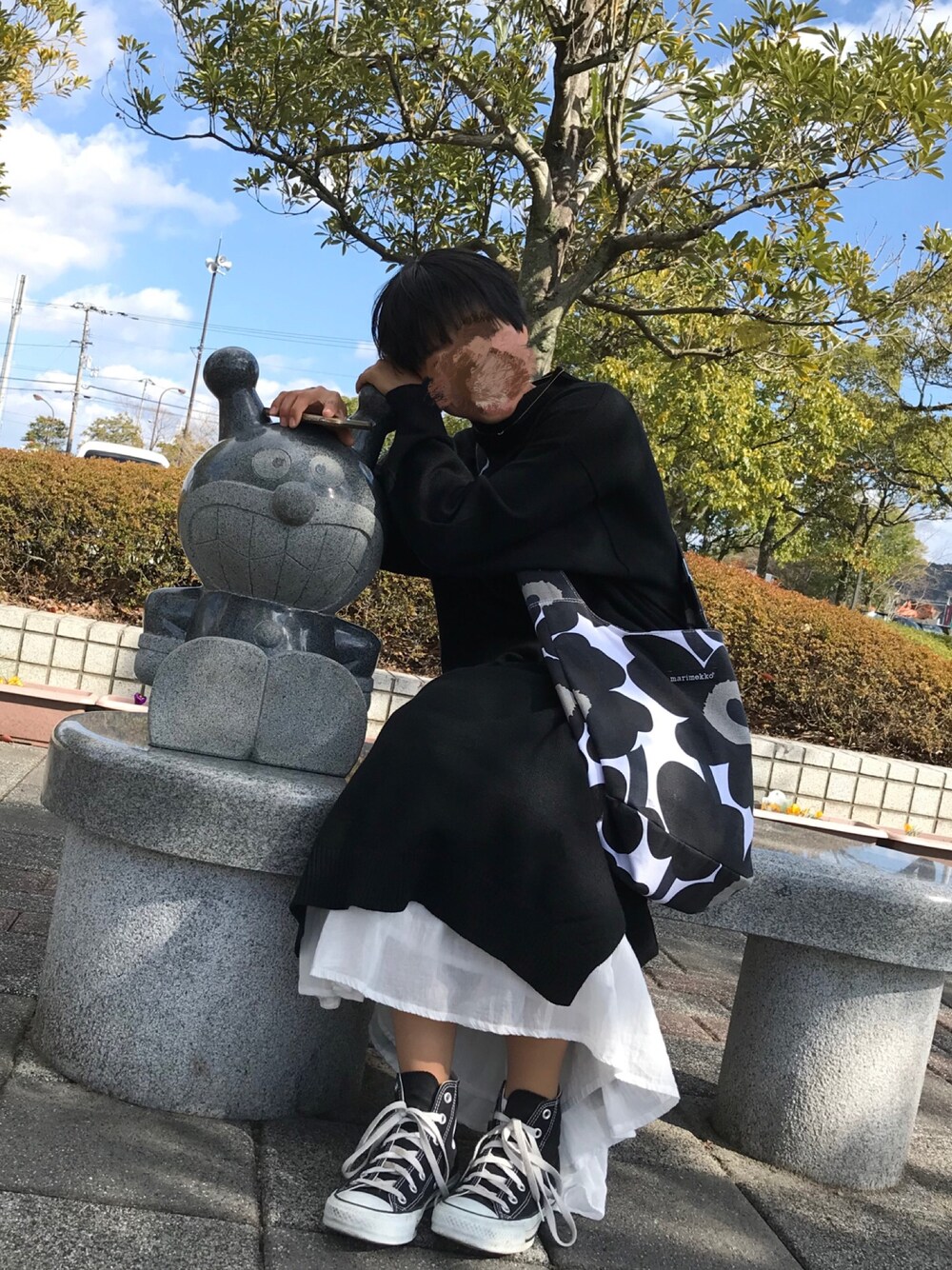 大人っぽい黒のワンピースの下に白のロングスカートを合わせることで可愛らしいコーデに変身です(*´˘`*)