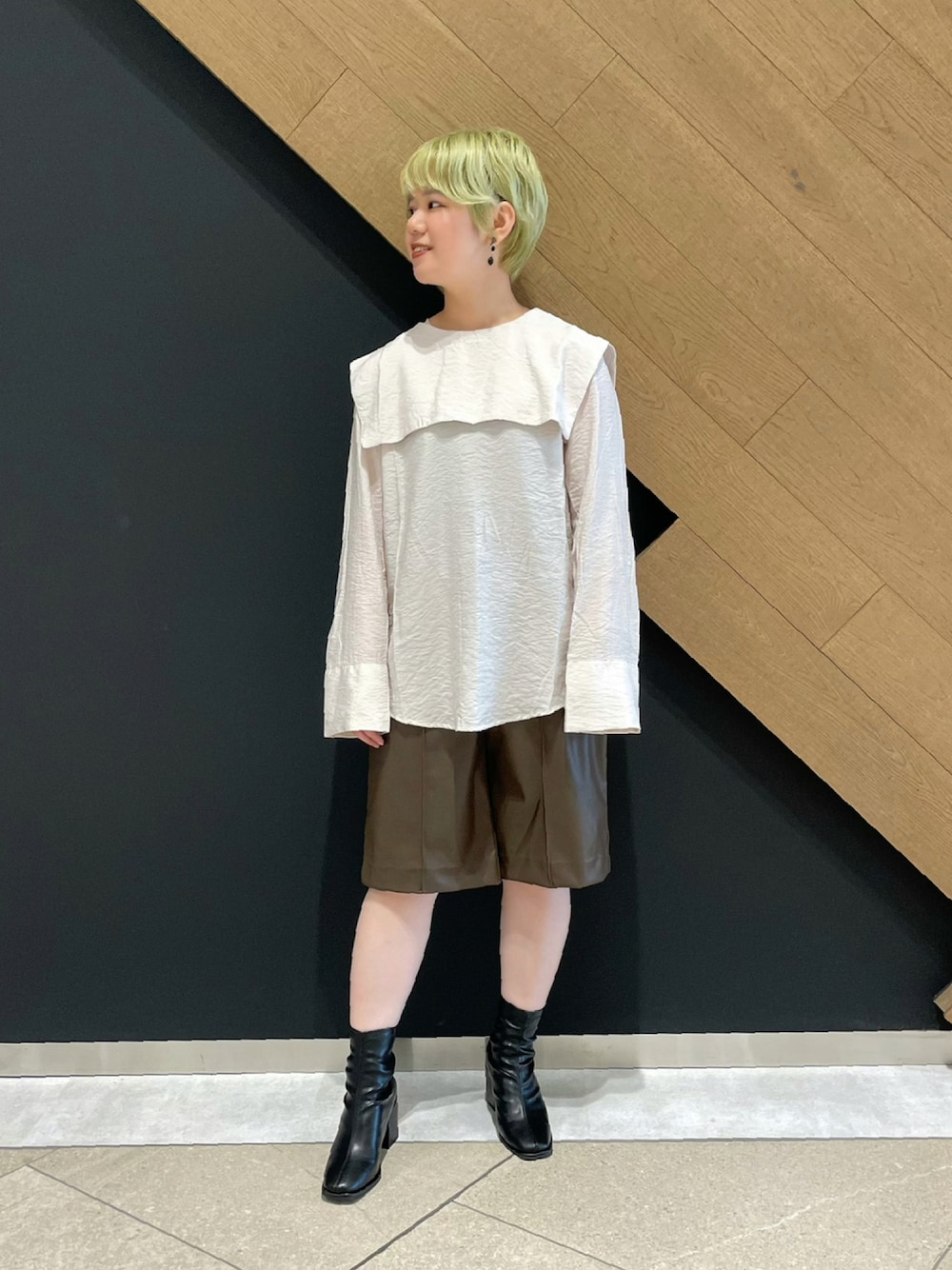 トップスはセーラーカラーの襟が可愛らしいです😊 薄めの生地なのでアウターも羽織りやすく長い期間で着用していただけます◎ ボトムスはハーフパンツにしてカジュアル感をプラスしました! レザー素材なのでカジュアルになり過ぎず綺麗めなコーデとも相性◎✨