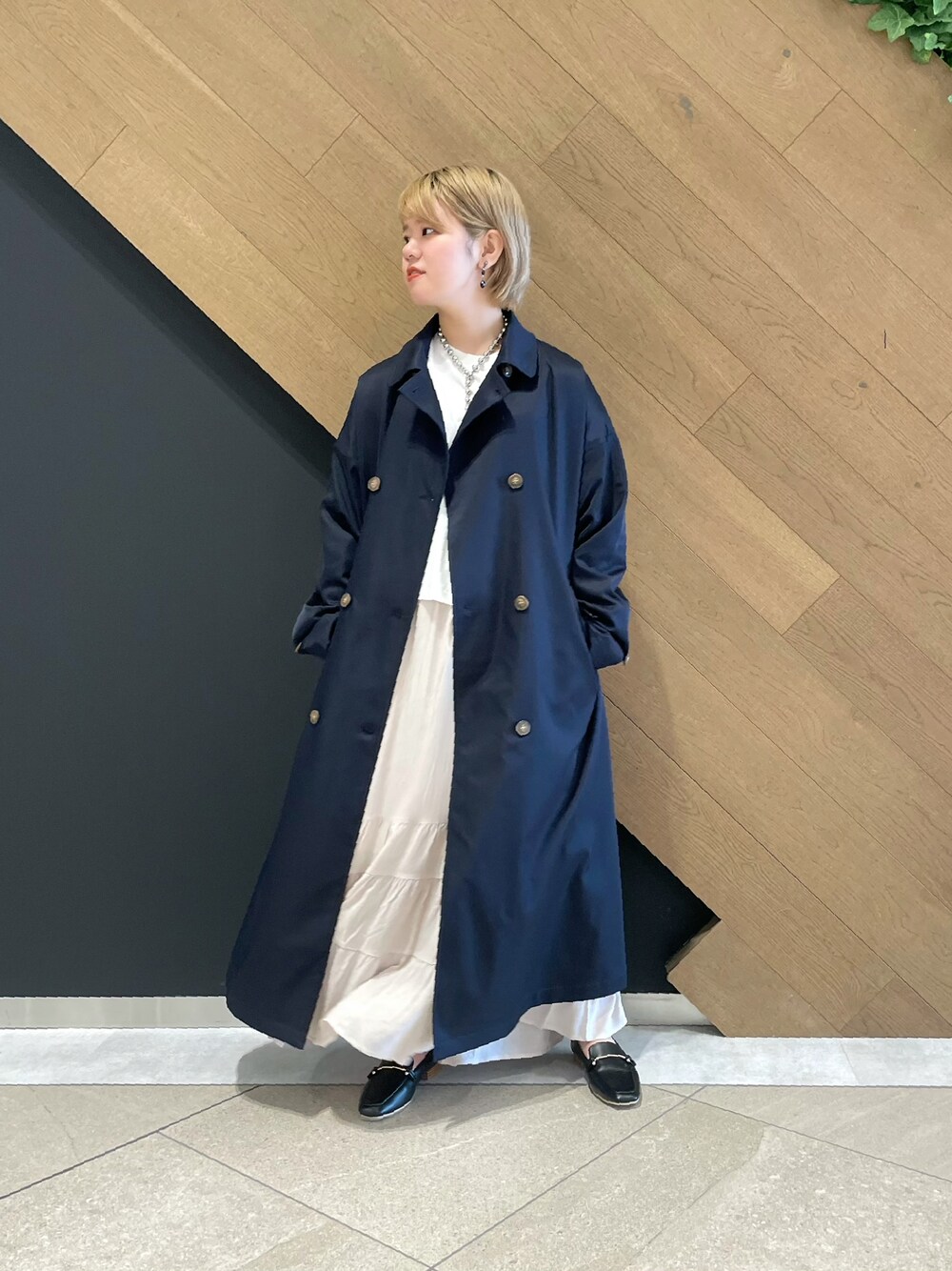 ロングコートを使ったコーデです☺️ コートはスタンドカラーで襟を立てたスタイルでも着ていただけるので違った雰囲気を楽しめます✨ 落ち着いたネイビーのカラーはカジュアルコーデにはもちろん、きれいめコーデや出勤コーデにもぴったりなアイテムです♪ ティアードスカートはふわっとした素材がとても可愛いです💕 スウェットなどを合わせてカジュアルダウンさせたり、ニットなどで可愛いスタイリングにするのがおすすめです♪