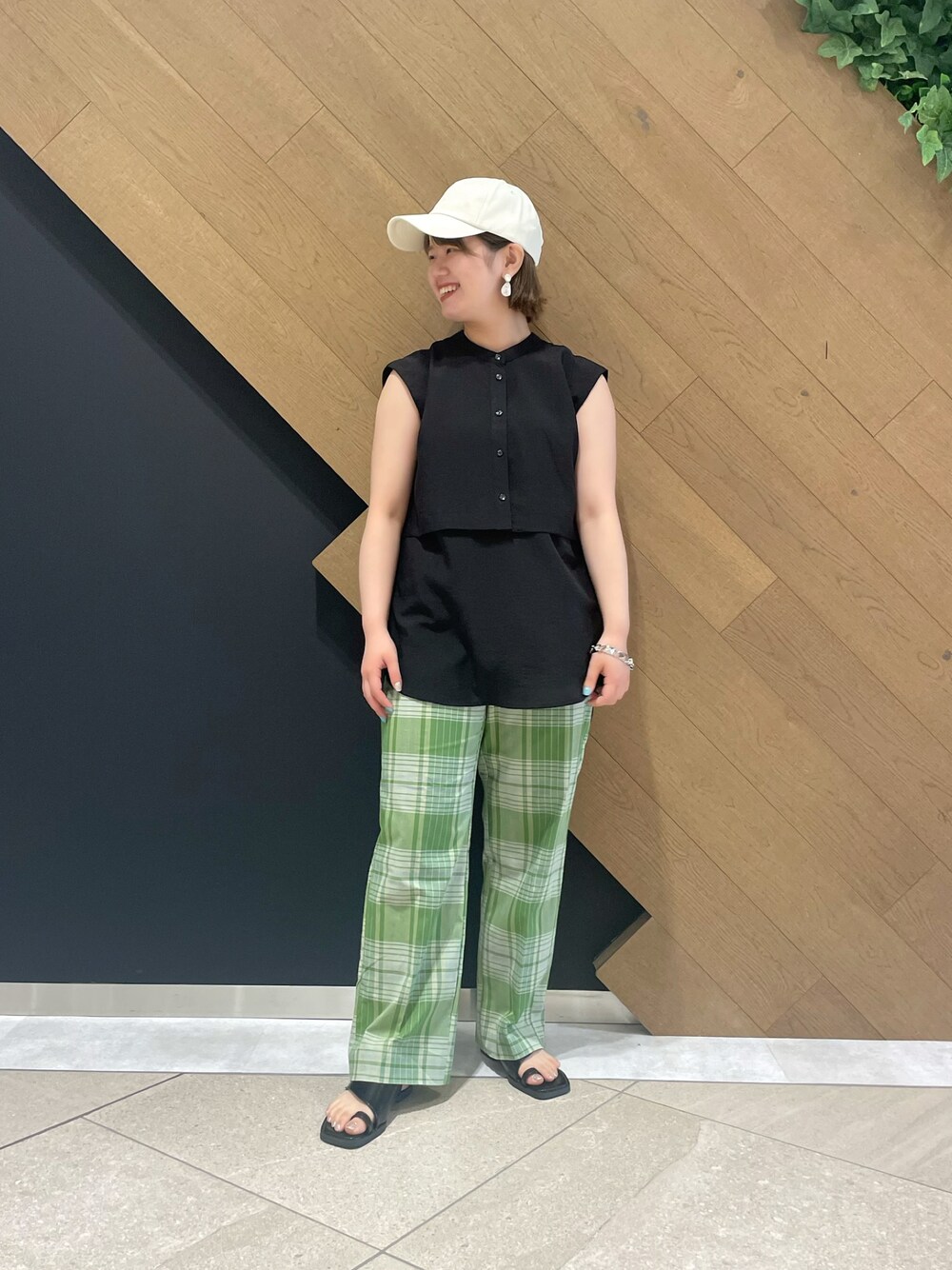 black× green トップスはベストがレイヤードされているのでシンプルですがこなれ感が出ます✨ 涼しい素材なので着心地◎ ボトムスはチェック柄がコーデのポイントになり可愛いです💕 ストレートパンツなので綺麗なシルエットで着用して頂けます☺️
