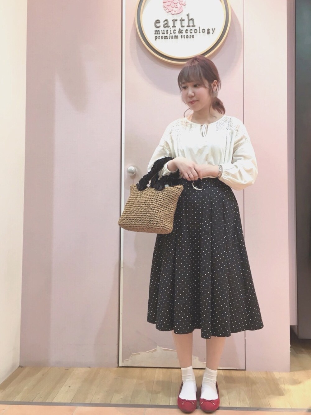 ブラウスとドットの大好きな組み合わせ⭕️ かごバッグは財布とちょっとしたポーチとか入れるのに ちょうどいい大きさ🌼 なにより持ち手のフリルが可愛すぎ💯 earthえきまち佐世保店、 可愛すぎる新作ぞくぞく入荷してます🤩💞